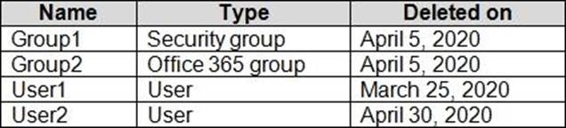 On May 4, 2020, you attempt to restore the deleted objects by using the Azure Active Directory admin center.