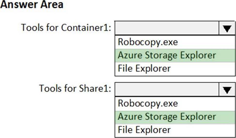 Which tool can you use to access the contents in Container1 and Share! by using the SAS? To answer, select the appropriate options in the answer area. NOTE: Each correct selection is worth one point.