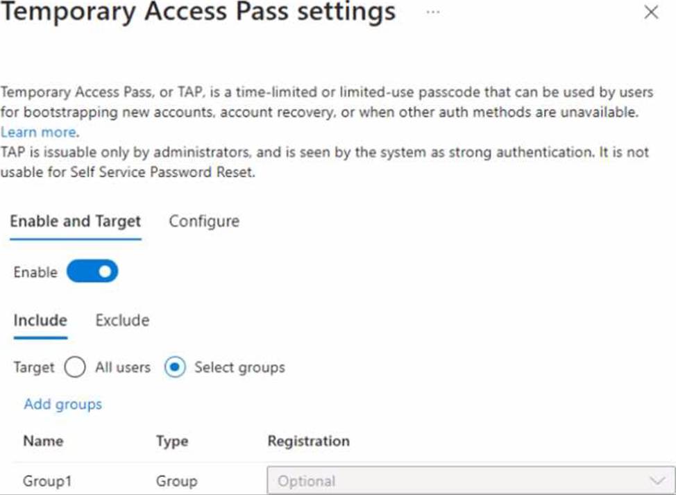 You configure the Temporary Access Pass settings as shown in the following exhibit.