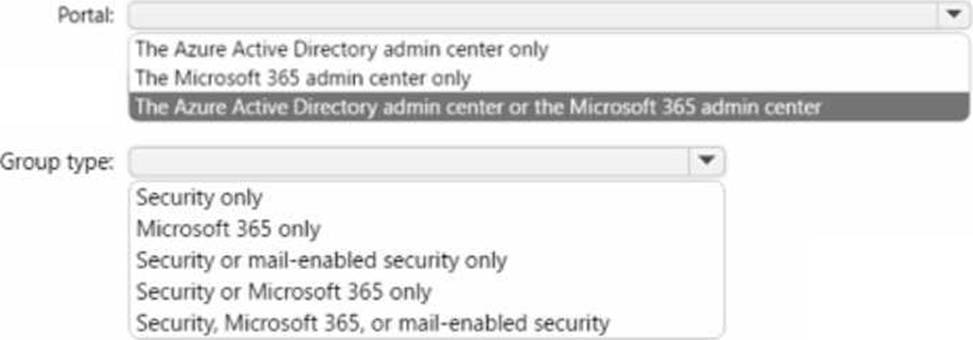 Which portal should you use to create Group1 and which type of group should you create? To answer, select the appropriate options in the answer area. NOTE: Each correct selection is worth one point