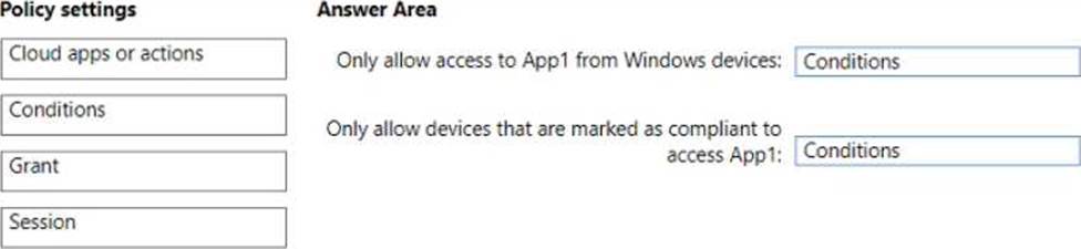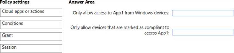 Which Conditional Access policy settings should you configure? To answer, drag the appropriate settings to the correct requirements. Each setting may be used once, more than once, or not at all. You may need to drag the split bar between panes or scroll to view content. NOTE: Each correct selection is worth one point.