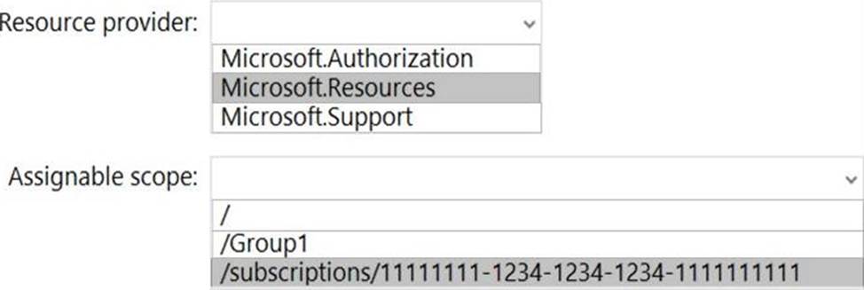 What should you include in the role definition of Role1? To answer, select the appropriate options in the answer area. NOTE: Each correct selection is worth one point.