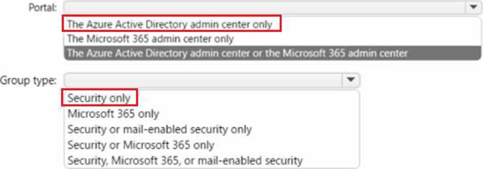Which portal should you use to create Group1 and which type of group should you create? To answer, select the appropriate options in the answer area. NOTE: Each correct selection is worth one point
