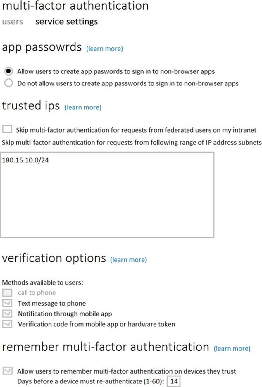 The multi-factor settings for contoso.com are configured as shown in the following exhibit.