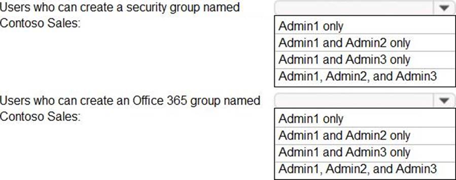 Which users can create a group named Contoso Sales in contoso.com? To answer, select the appropriate options in the answer area. NOTE: Each correct selection is worth one point.