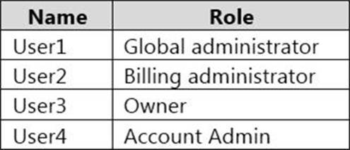 Subscription1 is associated with the Azure Active Directory tenant that includes the users shown in the following table.