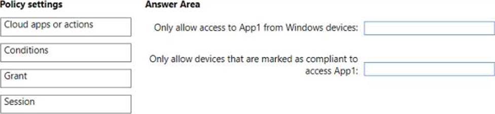 Which Conditional Access policy settings should you configure? To answer, drag the appropriate settings to the correct requirements. Each setting may be used once, more than once, or not at all. You may need to drag the split bar between panes or scroll to view content. NOTE: Each correct selection is worth one point.