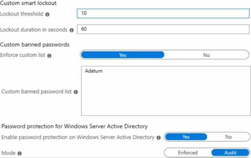 You configure the Microsoft Entra Password Protection settings for adatum.com as shown in the following exhibit.